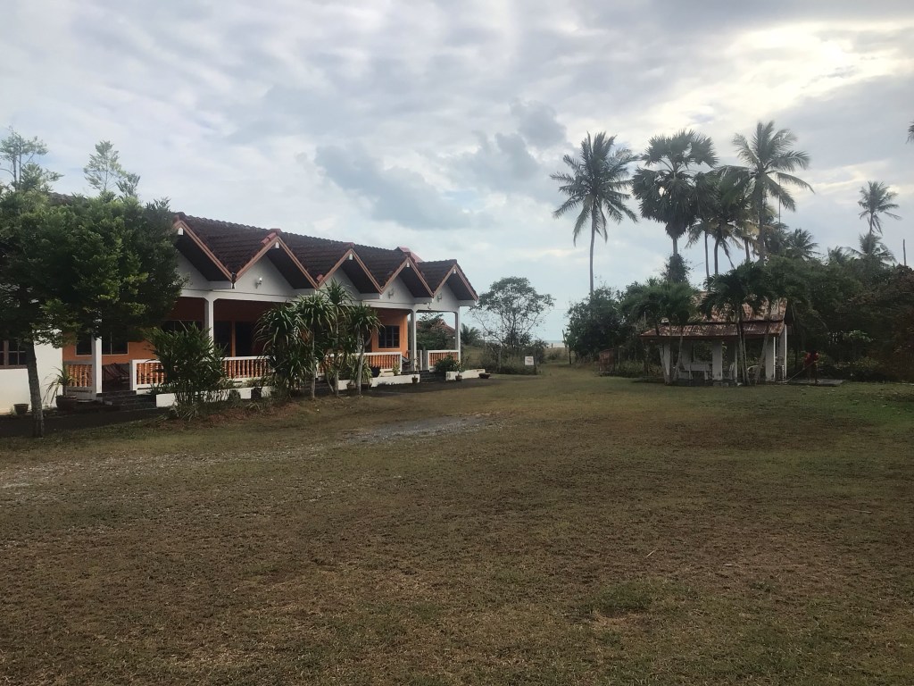 Nous avons le choix entre prendre la route 4112 qui coupe dans les terres et de cheminer pour retrouver la mer. La pluie a cessé. Le soleil perce sur la côte alors que de gros nuages restent accrochés aux montagnes. Nous partons donc vers la côte. Juste avant de bifurquer sur la gauche, nous nous arrêtons déjeuner. Ce matin, ce sera bouillon de poulet avec des nouilles au riz, soja, poulet. Et banane offerte.