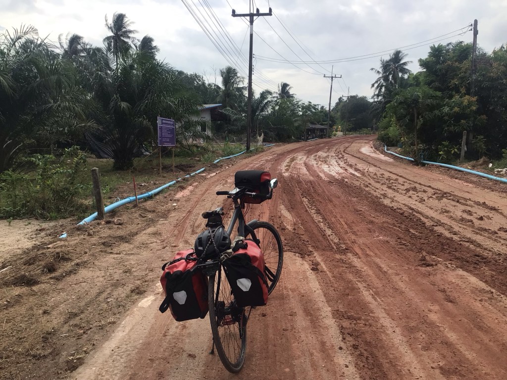 Alors que nous arrivons en vue de la côte, il nous faut auparavant traverser un petit village. La petite route bétonnée fait place à un mauvais chemin mal en point après les pluies de la veille. Je pose Haka2 et pars en reconnaissance. Impossible de passer, c’est vraiment trop merdique.
