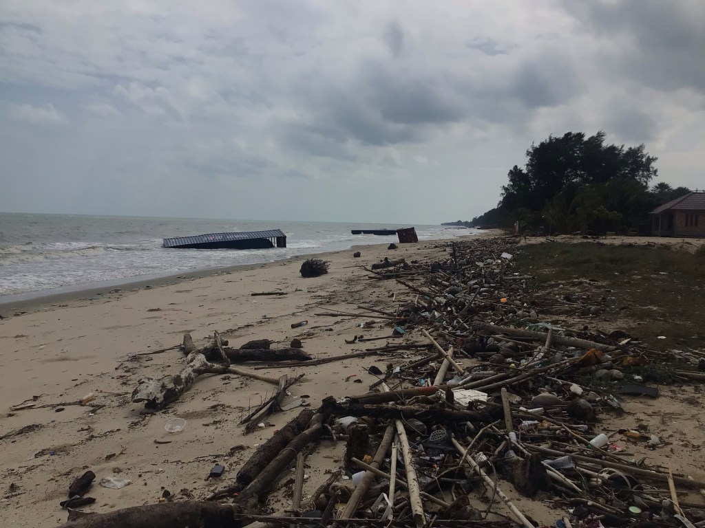 Demi-tour toute. Nous trouvons une autre petite route qui nous emmène sur la côte. Là, le spectacle est terrible. De nombreux containers se sont échoués sur la plage. La plupart des complexes hôteliers ont fermés. La plage est laissée complètement à l’abandon.
