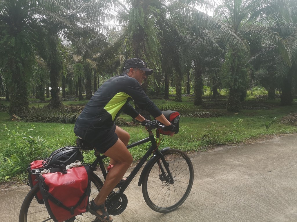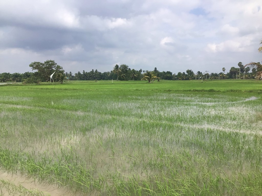 Ces marécages comblés ont fait place à de nombreuses cocoteraies et … à de plus en plus de palmeraies. De nombres fermes de pénéiculture sont également présentes. Je file bon train dans ce paysage toujours autant paisible.