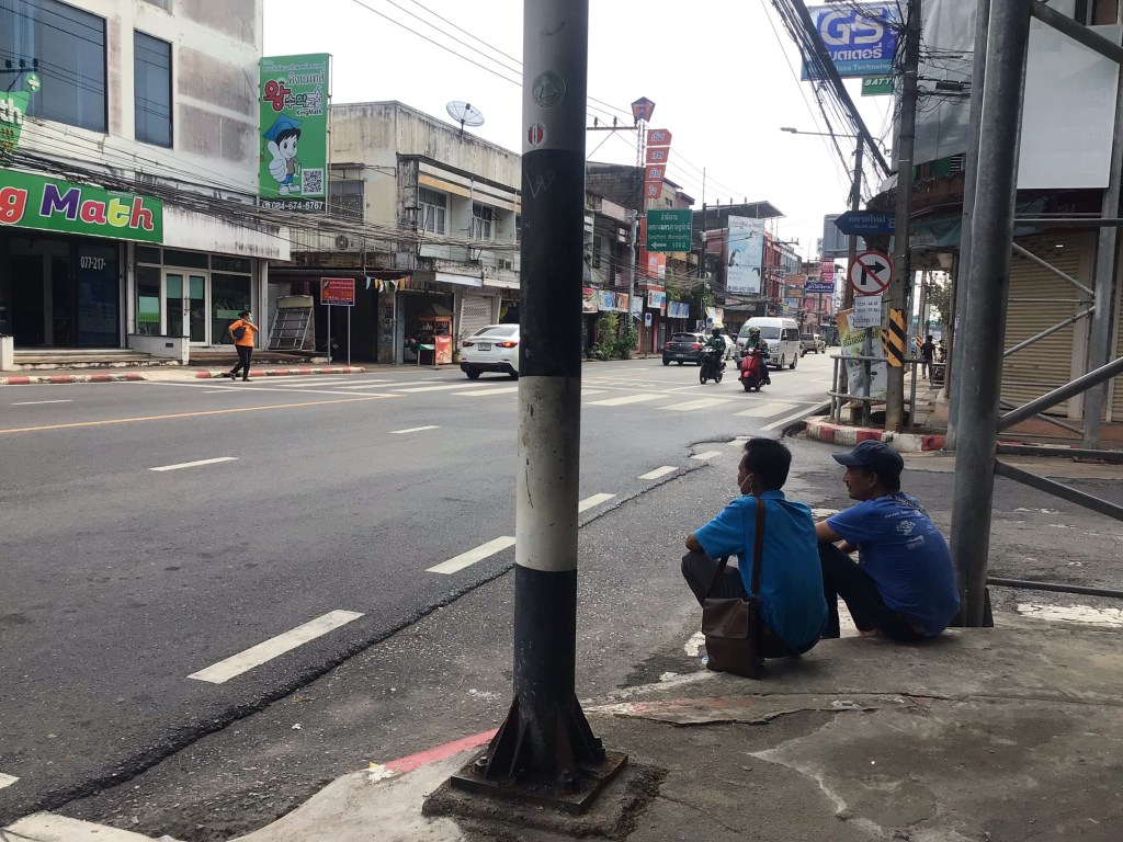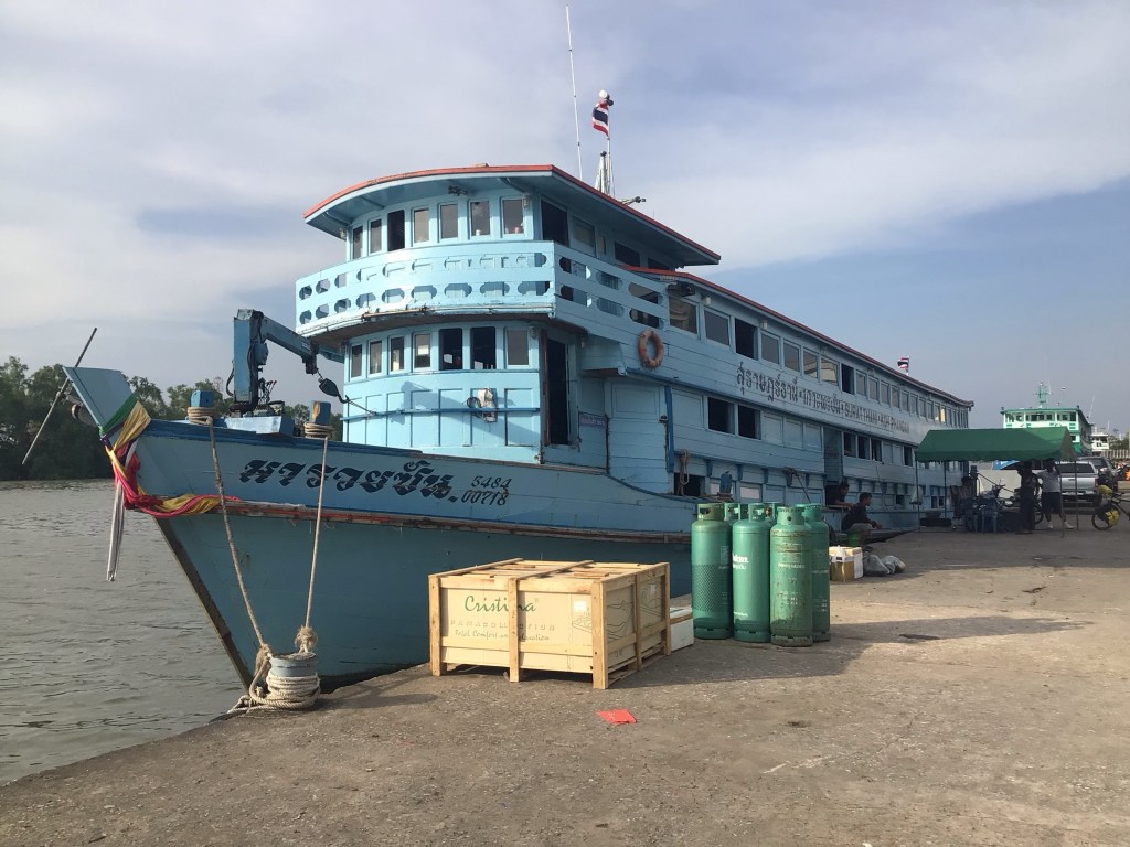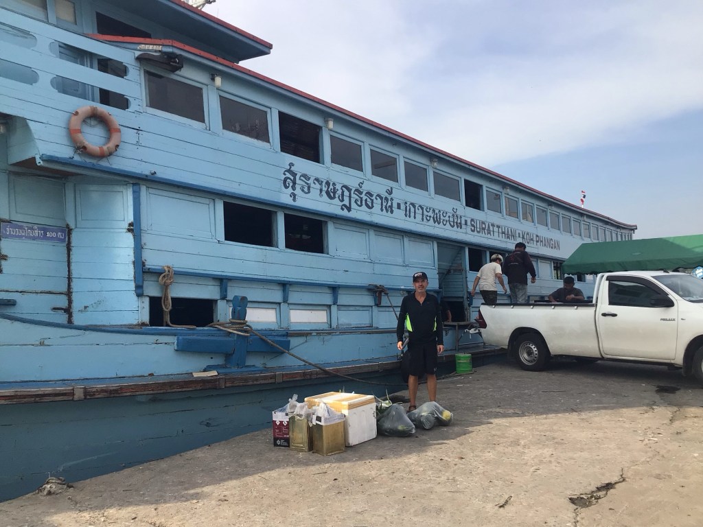 Après la ville de Tha Chang, nous bifurquons vers l’est pour rejoindre la grande ville « portuaire » de Surat Thani. Nous poussons les régimes dans les 15 derniers kms pour arriver après 15h et espérer prendre le ferry de 16h. Vers 15h15, nous arrivons le long de la Tapi River dans le centre-ville. Nous repérons un vieux bateau en bois qui partirait vers l’île de Ko Phangan. On se renseigne. Mais Nico, beaucoup prudent que moi, veut assurer le coup. Nous partons donc à la recherche d’infos concernant ces traversées.