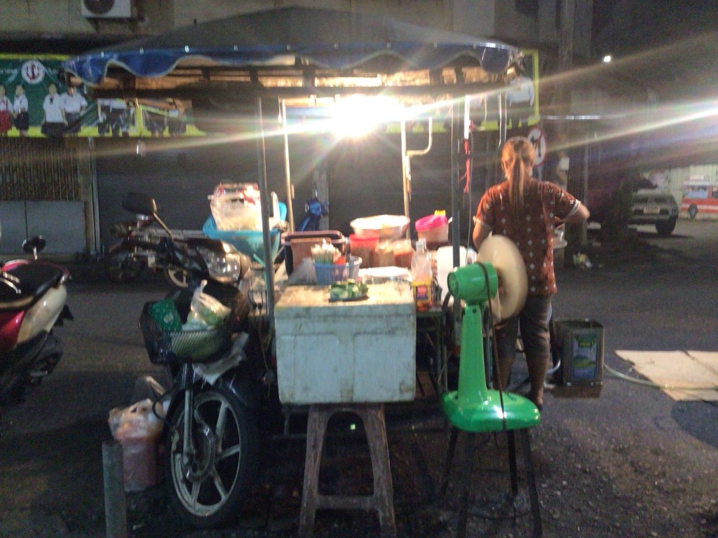 Ensuite, comme la pizza est trop tentante, nous allons dîner dans une rue perpendiculaire au port. De nombreux side-cars proposent des plats. On se pose à une table et mangeons un Pad Thaï puis un poisson frit. Un whisky thaï nous est offert par notre voisin de table.