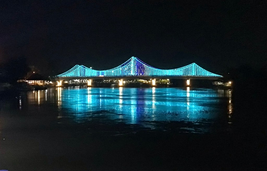 A 23h30, avec une petite demi-heure de retard pour cause de chargement tardif, le rafiot bleu largue les amarres pour une nuit de traversée. Nous quittons le fleuve en laissant le pont illuminé dernière nous.