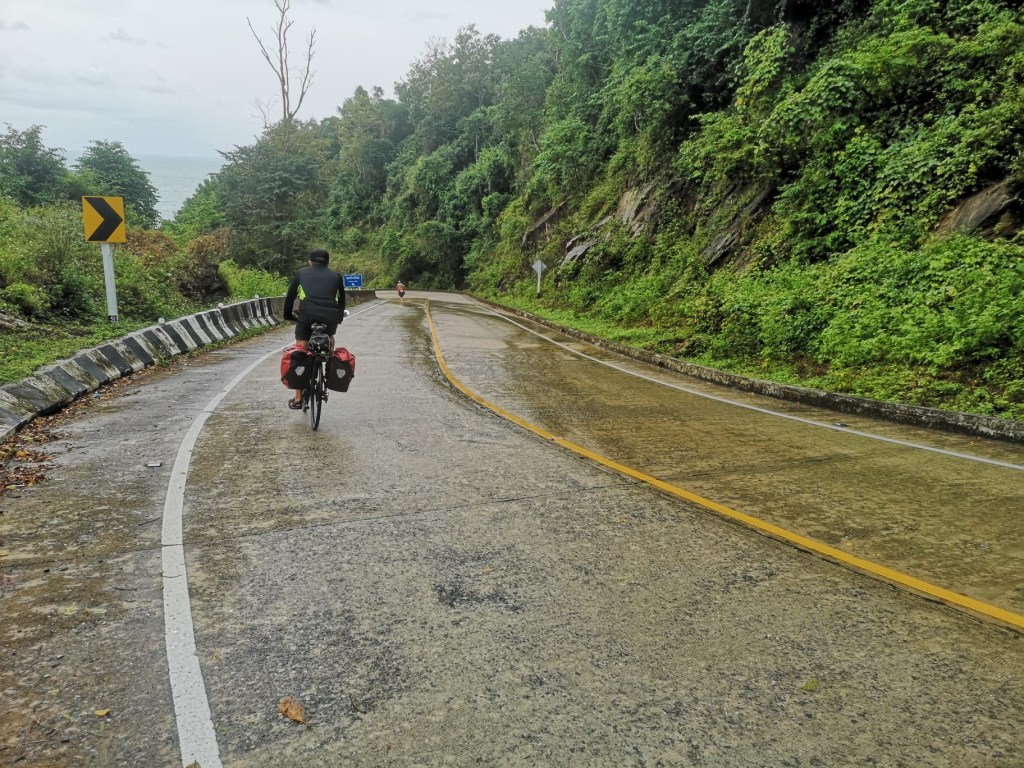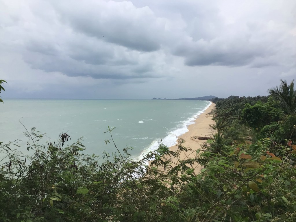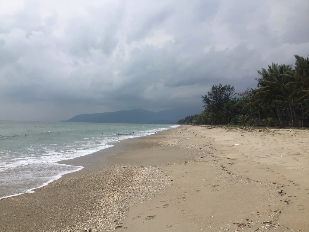 Un couple de farangs sort de l’eau. Ce sont les seules personnes présentes sur cette immense plage. La météo n’invite pas, non plus, à la baignade et à la bronzette. Nous filons vers le mauvais temps. De gros nuages noirs s’accumulent au-dessus des monts qui ferment cette baie. Le long de cette baie sont implantés de nombreux resorts. C’est à celui qui sera le plus extravagant. Pourtant, il n’y a vraiment pas foule.