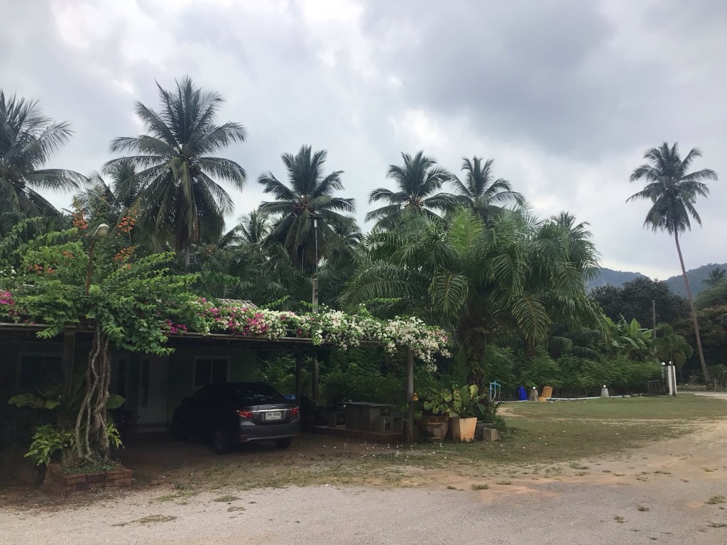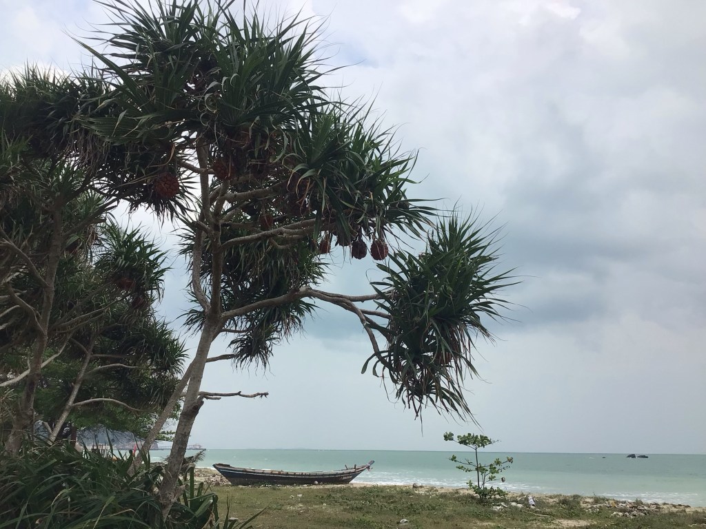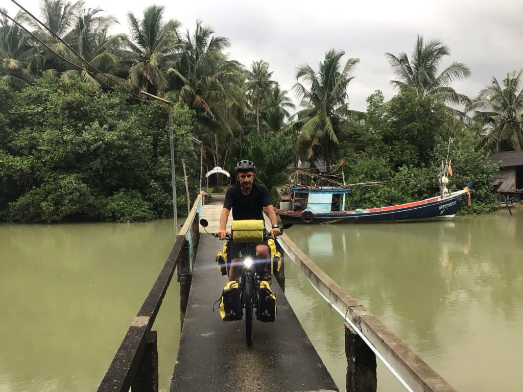 L’heure avance et la pluie repart. Il nous faut également quitter ce paisible lieu. Une nouvelle fois, je suis impressionné par la ferveur des fidèles ainsi que par l’accueil qui nous réservé par toutes les personnes de l’encadrement de cette fête. Nous traversons ensuite la ville sans charme de Sichon avant de partir en quête d’un nouvel hébergement. Nous en repérons un (Natural High Beach Café et Homestay) qui se trouve en bordure de plage mais a l’air compliqué d’accès. Effectivement, Nico confirme vu sa trombine pour traverser cette passerelle.