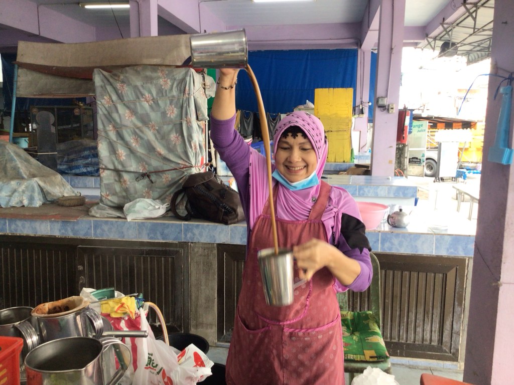 La circulation devient plus dense. Nous approchons de la ville de Khanom à l’embouchure du fleuve Khanom River. Nous nous arrêtons devant le marché couvert au repos. Une femme musulmane me prépare un délicieux café frappé avec une certaine dextérité, pour ne pas dire une dextérité certaine.