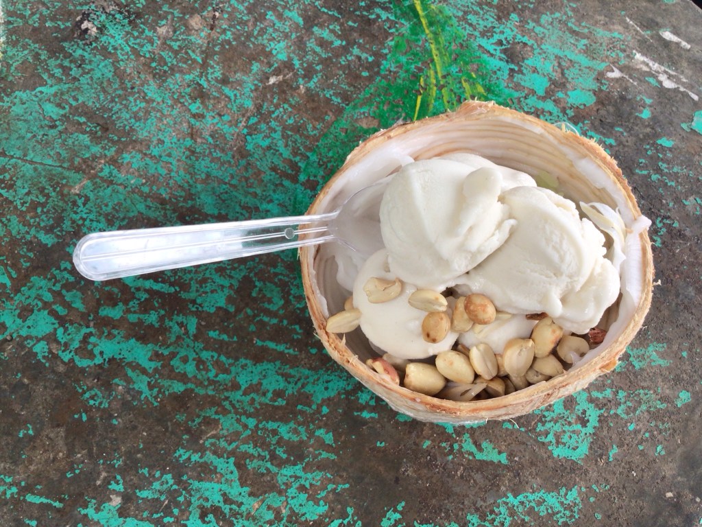Vers 12h30, nous nous arrêtons déjeuner frugalement à Ban Nai Phlao au bout de cette baie. Comme j’ai encore un petit creux et que j’aime bien finir sur un goût de sucré, je me tape une petite noix de coco accompagnée de glace vanille, de noisettes et de riz sucré. Un délice à 1€ acheté dans un side-car ambulant.