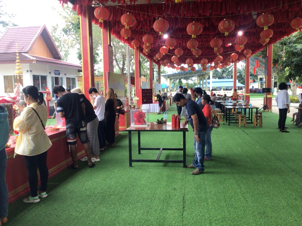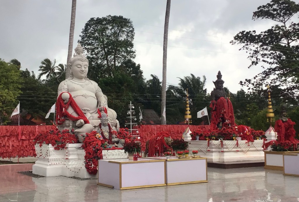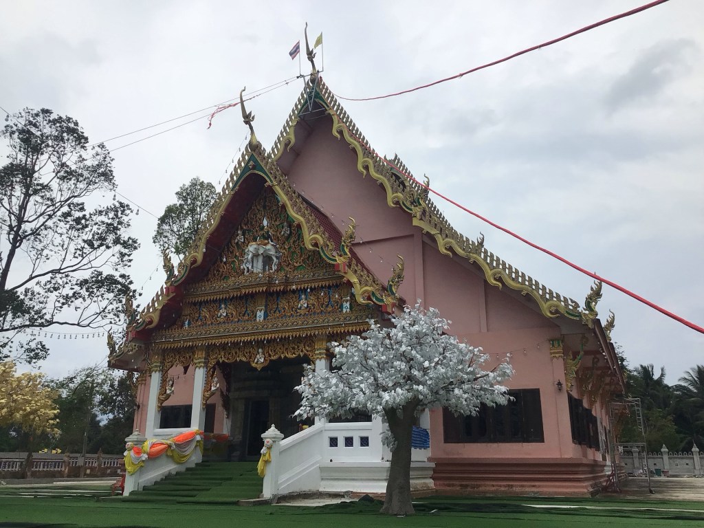 Nous reprenons notre petit bonhomme de chemin en suivant toujours la route côtière alors que la pluie a cessé. En arrivant en périphérie de la ville de Siphon, je suis attiré par un attroupement à l’entrée du temple de Wat Suchon. Nous posons à nouveau nos vélos et entrons dans ce temple où une fête religieuse bouddhiste a lieu.