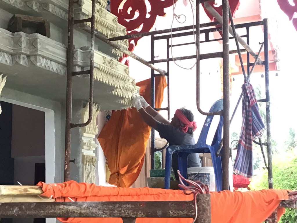 Alors que nous allions rentrer à l’intérieur, nous découvrons un sculpteur en plein travail en train de modeler le portail d’entrée avec du plâtre. Nous restons un long moment à l’observer. Il moule chaque pièce à la main avant de les ajuster puis de les superposer. Une petite truelle ovale lui permet de ciseler les détails. Impressionnant !