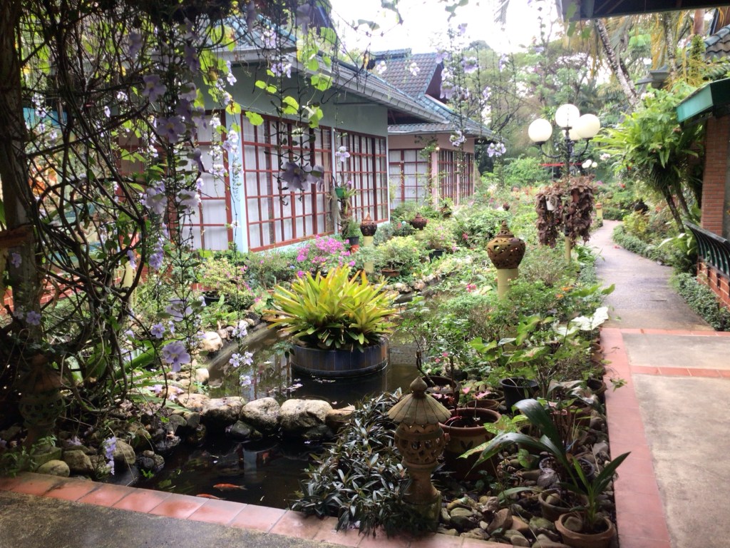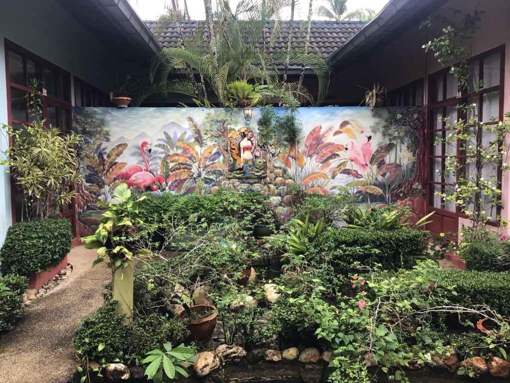 Le jardin est splendide. Comme dit la propriétaire : « Il suffit de planter que pour ça pousse ! ». Mais il faut quand même l’entretenir. Des fresques murales animalières sont peintes entre les petits bâtiments.