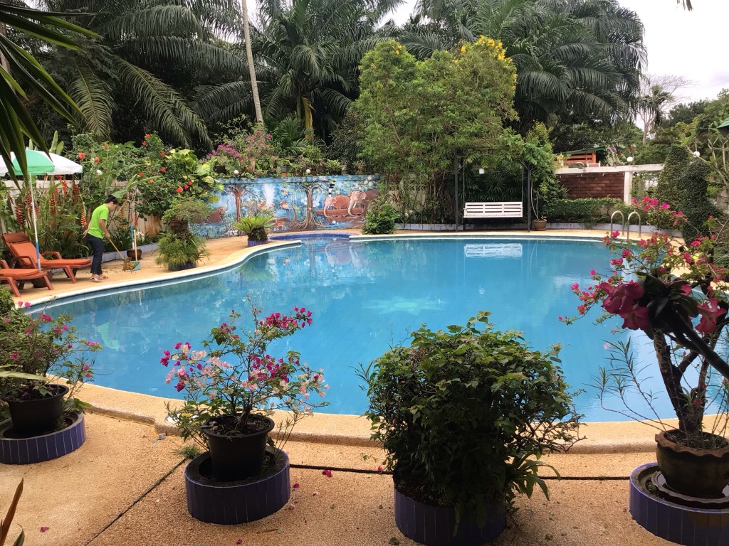 Une belle piscine invite à la baignade mais la météo ne s’y prête pas trop quand même. Le ciel est à nouveau couvert. Une femme de ménage nettoie déjà la plage. En Thaïlande, ce sont vraiment les rois de la balayette.