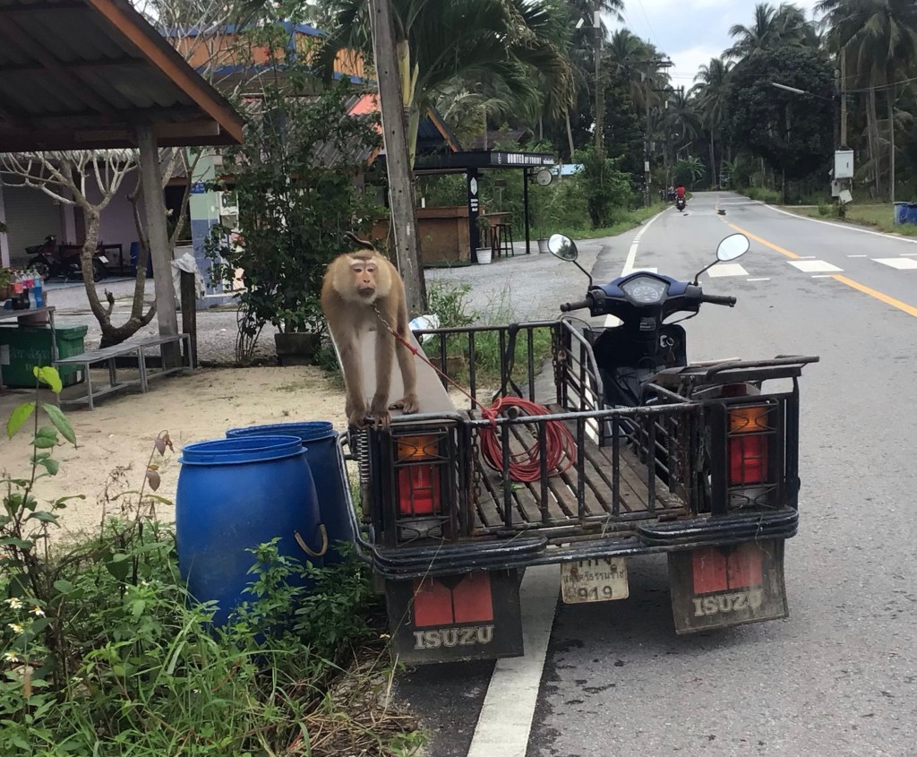 Quant à ce macaque, il attend son chauffeur pour partir lui aussi au taf. En rouge, vous apercevez la longe qui lui permet de ne pas se sauver en grimpant aux cocotiers. Nous croisons au large ce side-car. L’animal est apprivoisé mais quand même agressif. Et une morsure est vite arrivée.