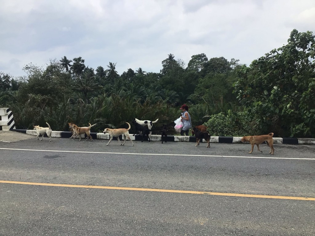 Nous continuons notre pérégrination vers le sud. Comme ces nombreux chiens errants que l’on croise sur notre route. Cette femme vient leur apporter des croquettes. Sans cela, je me demande de quoi ils se nourrissent.