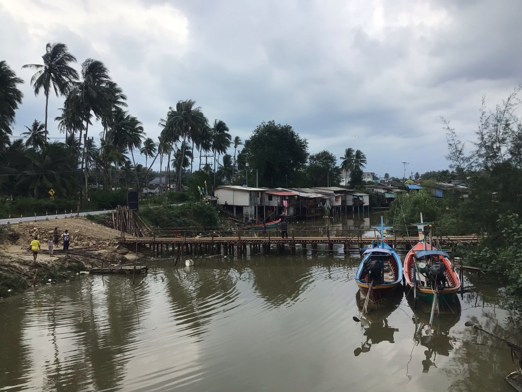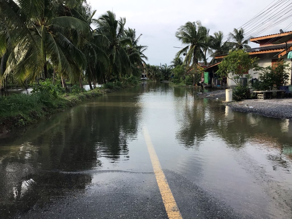 Vers 13h00, nous nous arrêtons déjeuner alors que nous sommes « trempés-guenés » comme disait ma grand-mère. Après cette accalmie, nous reprenons notre route pour revenir vers la côte. De nombreuses rivières se jettent dans ce golfe fermé par la pointe de Laem Talumpuk. Et ça déborde de tous les côtés ! Heureusement, la pluie a cessé alors que nous nous rapprochons de la côte.