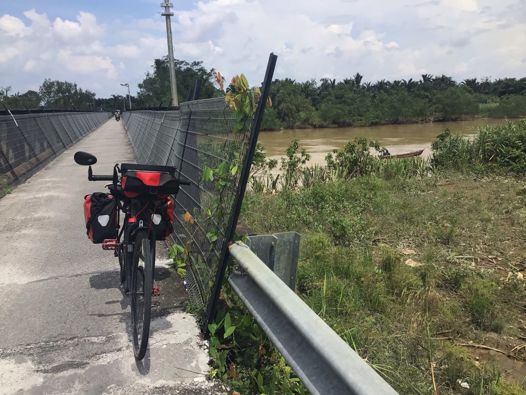 Nous nous arrêtons déjeuner dans la première gargote trouvée. Les villages sont rares dans le coin. Nous sommes à Air Kuning, village jumelé avec celui de Air Lingus au Laos. Les plats sont en libre-service mais il ne reste plus grand chose. J’opte pour une belle assiette de poissons frits de rivière avec du riz et des légumes estimée à 5RM (1€). Il nous faut repartir sans trop tarder vu que les orages sont annoncés en milieu d’après-midi. Nous filons bon train. Vers 14h30, nous arrivons en périphérie de Teluk Intan. Nous franchissons la Bidor River, un autre affluent du fleuve Perak, par une passerelle pour deux-roues tandis qu’un pêcheur remonte la rivière sur sa barque à moteur.