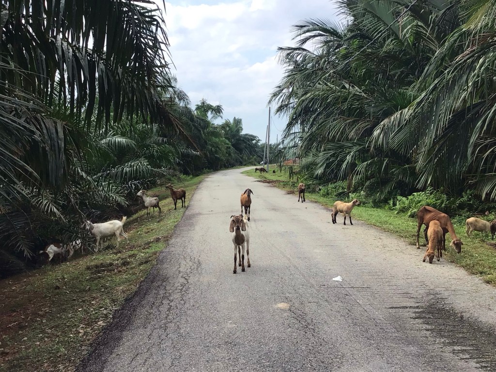 Le ciel s’assombrit. Des orages sont annoncés plus tôt que d’habitude dans cette zone marécageuse. Quant à nous, nous nous dirigeons vers l’océan, ou tout du moins la mer d’Andaman, où la météo devrait y être plus clémente. Nous empruntons dorénavant un réseau de petites routes qui nous rapprochent de la mer. Les plantations de palmier à huile sont toujours aussi nombreuses. Nous entendons du bruit dans les arbres. Nous ralentissons. Ce sont à nouveau des singes. Il y a des bagarreurs qui font un boucan d’enfer, des équilibristes qui se baladent sur les fils de télécommunication et des affamés qui se régalent des restes de nourriture dans les décharges et sur les bas-côtés.