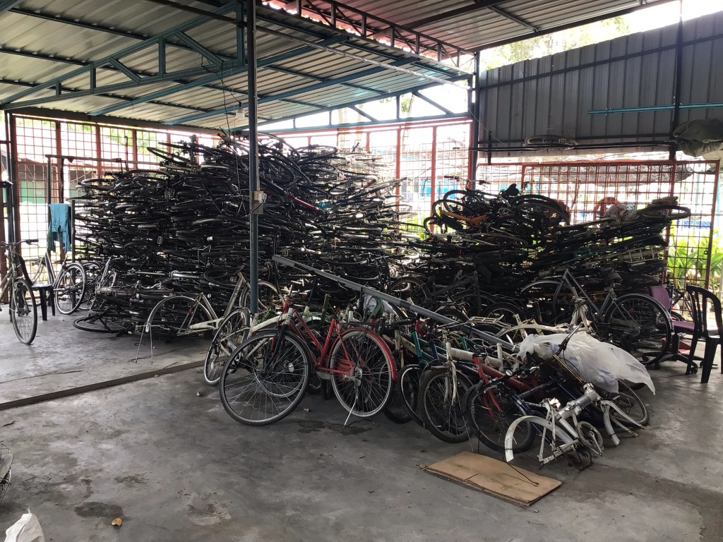 Nous rejoignons enfin la côte mais qui est difficilement accessible. Nous traversons le village de Sungai Besar. Nico aperçoit un magasin de vélos. Il s’arrête à la recherche de graisse pour sa chaîne et d’une nouvelle gourde. Mais il n’y a pas. Par contre, le stock de vélos en attente de reconditionnement est impressionnant. J’aurais du boulot pour le restant de mes jours avec tout ce stock dans mon atelier-vélo de l’Arche !