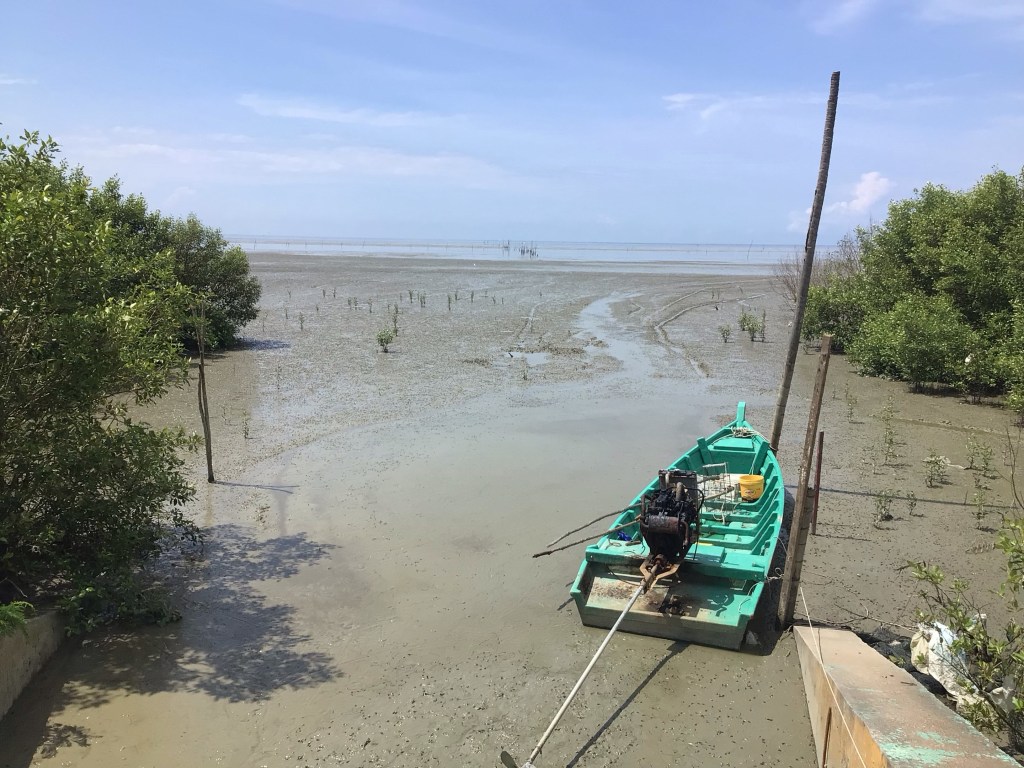 De temps en temps, nous devons emprunter des chemins moins carrossables le long d’un canal d’irrigation. Les vaches paissent tranquillement. Elles regardent passer, non pas les trains, mais les cyclistes en vadrouille. Derrière elles, la mangrove et la mer.