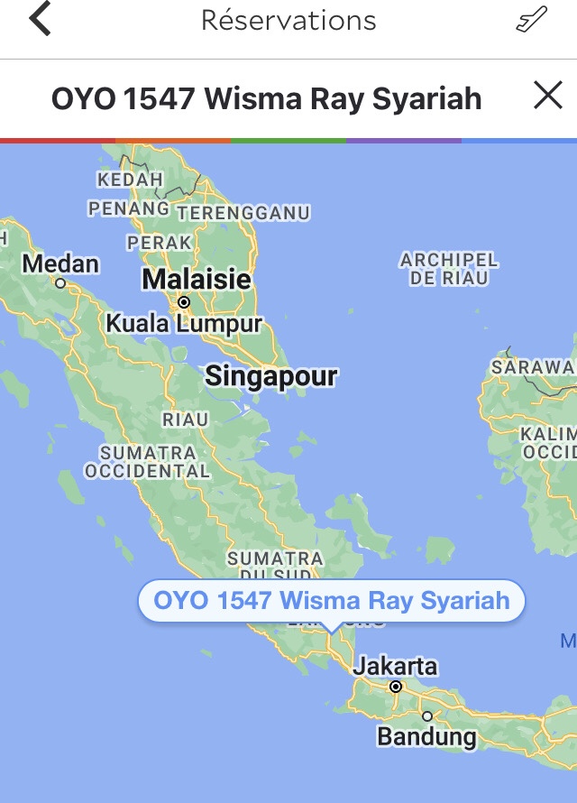 Nous arrivons enfin à Tanjung Karang, terme de cette étape. Nous nous posons dans un endroit à l’ombre pour réserver une chambre. J’en trouve une pas chère du tout (16 RM), bien notée et situé dans le centre. Je réserve de suite. J’active la localisation. Cette chambre se trouve … sur l’île de Sumatra en Indonésie ! Comme la réservation est confirmée et la somme prélevée sur mon compte, je vais devoir réclamer le remboursement. Franchement, j’ai bien d’autres choses à faire ! Nous faisons une nouvelle recherche plus « ciblée » mais ne trouvons rien dans nos tarifs. Il nous faut poursuivre notre route jusqu’à la prochaine ville de Kuala Selangor à une quinzaine de kms au sud. Soit 1 heure de route en plus.