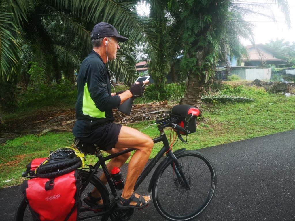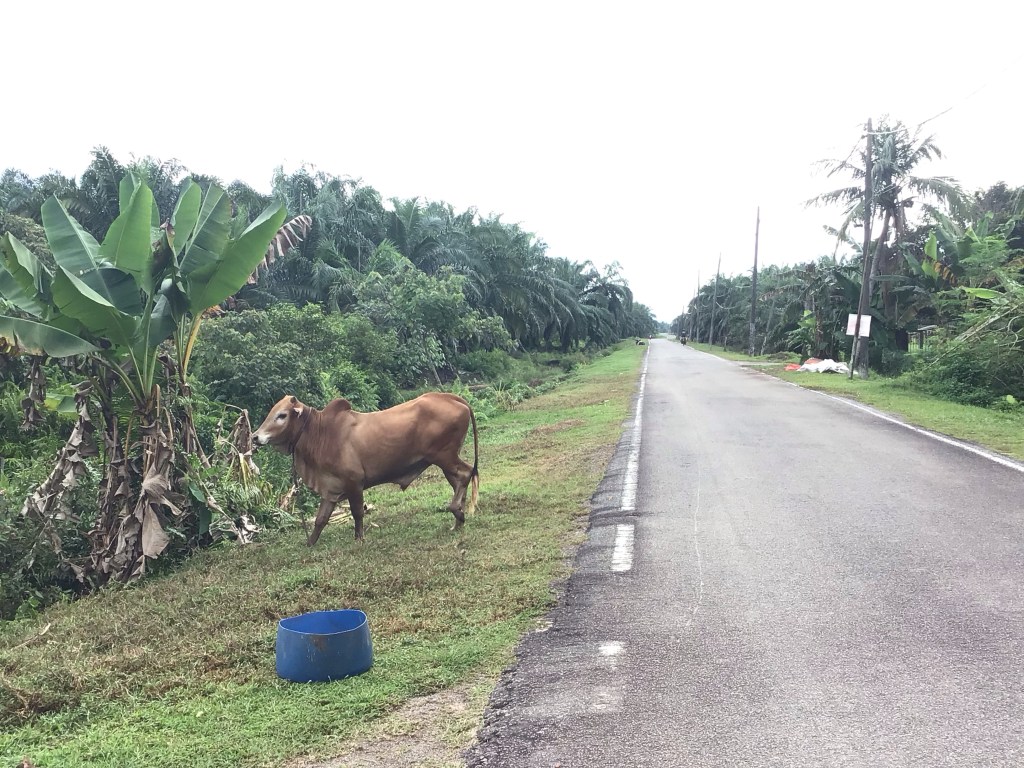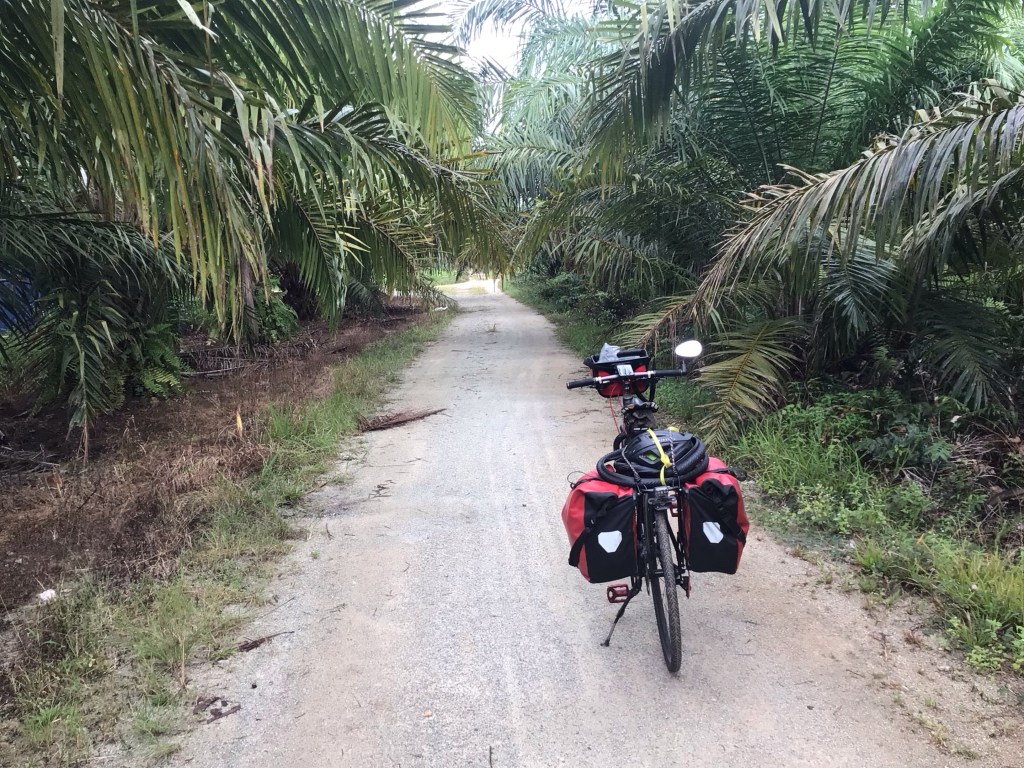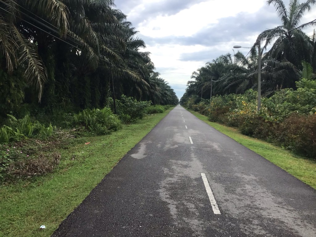 Vers 8h15, nous quittons cette ville. Nico-la-science (et toc de la part d’Audika) n’a pas la pêche ce matin. Il traînasse. C’est pourtant lui qui assure la trace aujourd’hui. Et cela va s’avérer coton (ou plutôt palmier) toute la matinée. En effet, nous avons décidé de passer à l’ouest de l’aéroport de Klia et d’éviter la route 5 en bordure de côte. Nous allons donc passer notre matinée à zigzaguer entre les plantations de palmiers. C’est évidemment beaucoup plus calme que sur la route principale. Nous roulons principalement sur de petites routes aux grandes lignes droites et au bon revêtement.