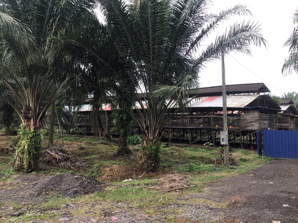 Les distractions sont rares. Pour faire passer le temps, j’ai branché ma musique sur Led Zepp’. Cela me file la patate. Et puis, quelquefois, nous nous arrêtons pour prendre une photo. Dans ce cas, c’est une ferme d’élevage de poulets (Ayam) perdue au milieu des plantations. Il y a plusieurs « bâtiments ». En fait, ce sont plutôt de grandes structures montées sur pilotis. Les poules résident au 1er étage.