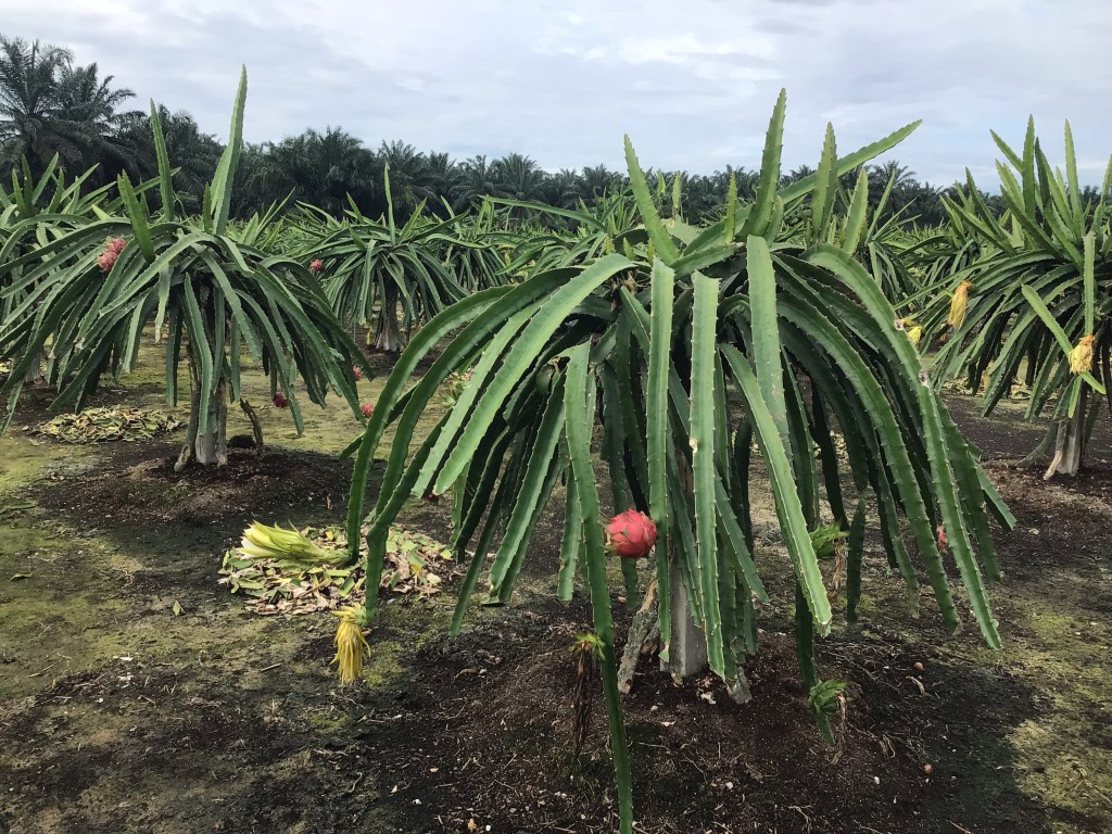 Nous en dégustons un. Ce fruit a la texture du kiwi mais en rouge et en moins sucré. Après avoir visité la plantation et discuté un bon moment, nous repartons avec un sac empli de ces fruits. Nous quittons le patron, son acolyte ne parlant que malaisien et deux jeunes ouvriers dont un porte le maillot du PSG. A ce sujet, lorsque des malaisiens nous demandent notre nationalité («Where do you come from ? »), nous répondons souvent Mbappé ou Zinédine Zidane. De suite, ils comprennent France !