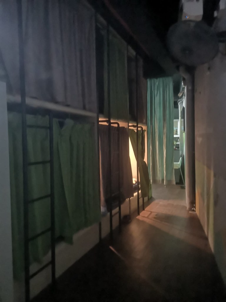 Peu après, nous nous posons dans une gargote fermée pour une micro-sieste. Et nous repartons pour une nouvelle séance de tournicotis. J’ai parfois l’impression de tourner en rond. Je ne sais pas si on arrivera un jour à Melaka. C’est clair que, tout seul, j’aurais taillé au plus direct pour en finir au plus vite. Des immeubles apparaissent enfin. On se rapproche. Nous empruntons un grand boulevard urbain avant d’entrer dans le centre-ville. Vers 16h00, nous rejoignons notre auberge de jeunesse réservée ce midi. Comme à Bangkok, nous allons dormir dans un box …
