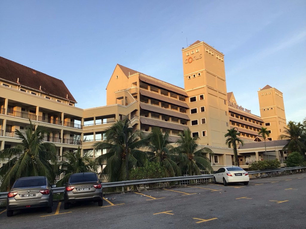 En fin de matinée, nous rejoignons la mer à Kampung Sungai Tuang. La plage est propre et ratissée. Cependant, nous n’y voyons aucun plagiste. Seul un pêcheur ramène sa barque au sec aidé par sa femme. Au large, les méthaniers attendent pour décharger leur cargaison.
