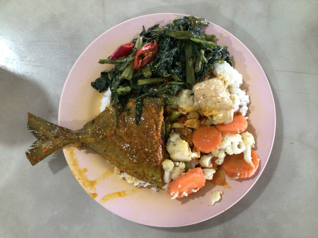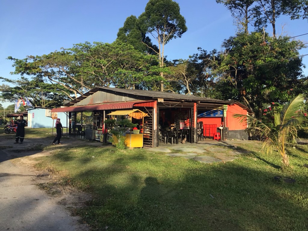 Nous continuons notre pérégrination en suivant la côte par une petite route. Nous retrouvons le plaisir du cyclotourisme quelque peu gâché par ces longues lignes droites sur des routes étroites et très empruntées, à travers les palmeraies. Malheureusement, il nous faut remonter dans les terres pour éviter le Canjuers malaisien, un terrain militaire interdit occupant un large territoire jusqu’à la mer. Peu après midi, nous déjeunons à Kampung Sungai Duku dans un des restaus au croisement de la route principale 5 et de notre route M161. Comme nous ne sommes pas très loin de la mer, ce sera poisson pour moi ce midi. Je ne sais pas ce que c’est mais il est succulent. La sauce est « légèrement » épicée.