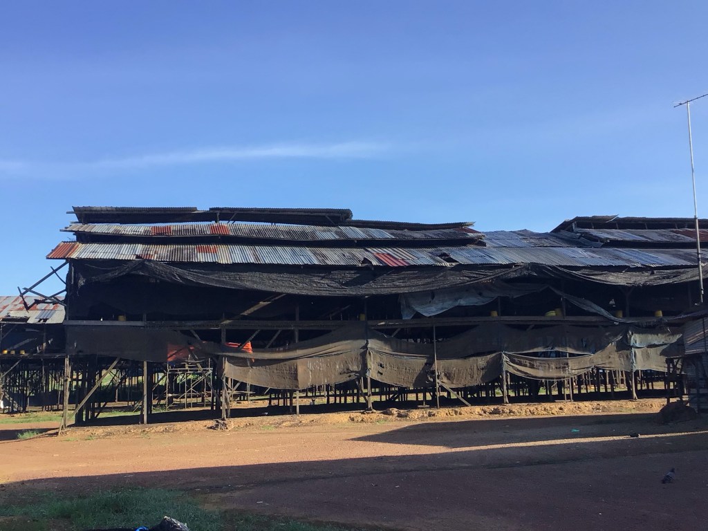 Dans ce cheminement campagnard, nous longeons des fermes d’élevage de bovins et, à nouveau, de poulets. Les structures sont toujours les mêmes. Les pauvres poules ne doivent pas voir beaucoup le jour et encore moins gambader dans les prés.