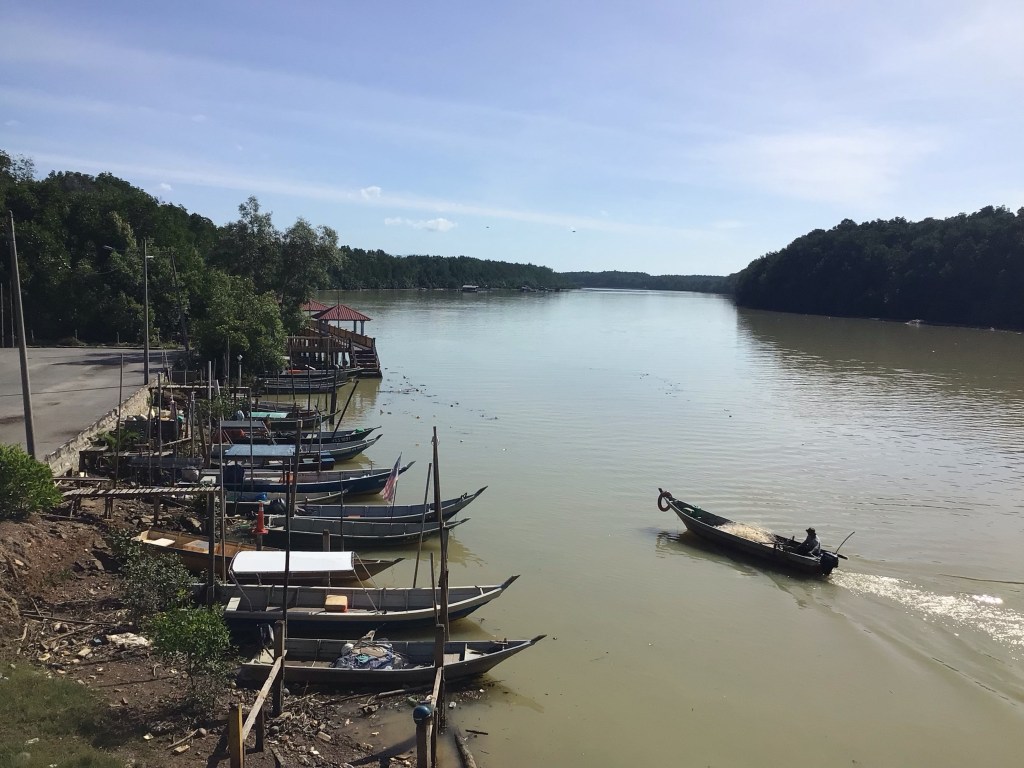 Nous redescendons à présent vers la côte en empruntant la route 138. Près de l’embouchure, nous traversons le fleuve Sungai Linggi alors qu’un pêcheur rentre au port.