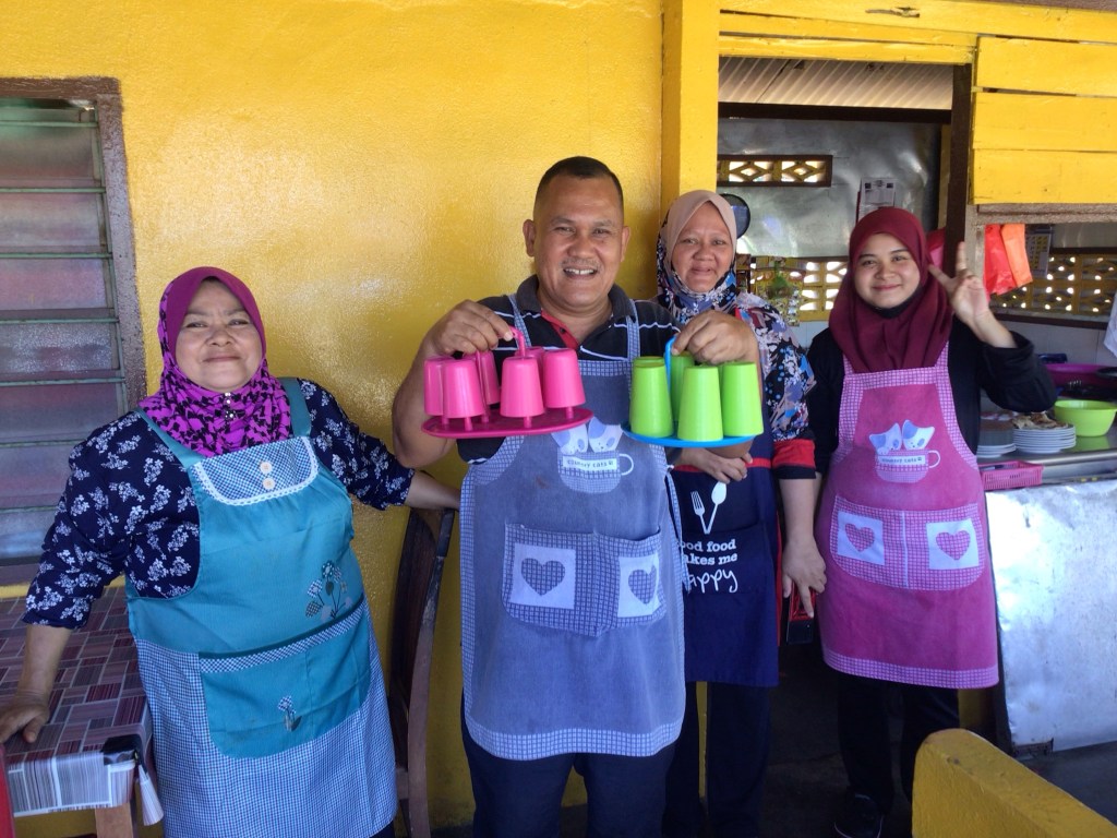 En milieu de matinée, nous nous arrêtons à Tanjong Dahan pour notre pause syndicale : citron glacé pour Nico et café noir chaud sans lait (kopi ô pana) pour moi. L’endroit est bondé. A côté de notre table, un gars costaud entame la conversation. Il est marin et travaille pour Gaz de France. Il déjeune avec son équipe avant de partir dans un port dont nous ne saisissons pas le nom. A une autre table, c’est une famille avec parents, fille et garçon handicapé mental, grand-père maternel qui nous interpelle. Et puis, il y a le patron qui met l’ambiance dans son restau en présence de sa petite famille.