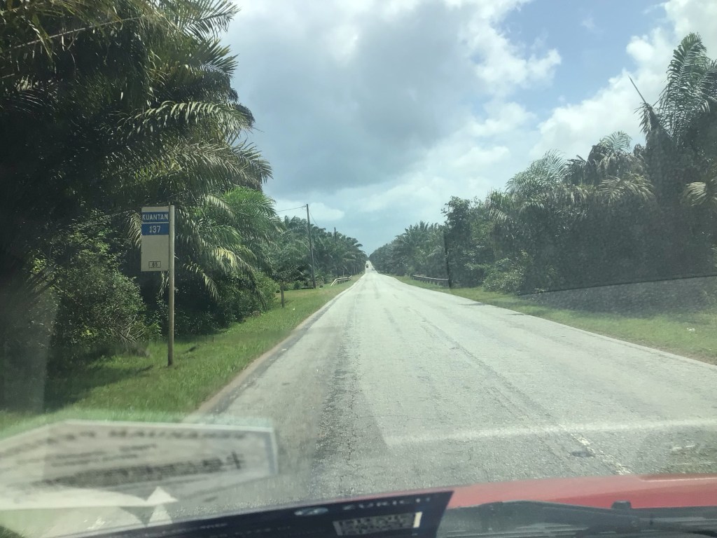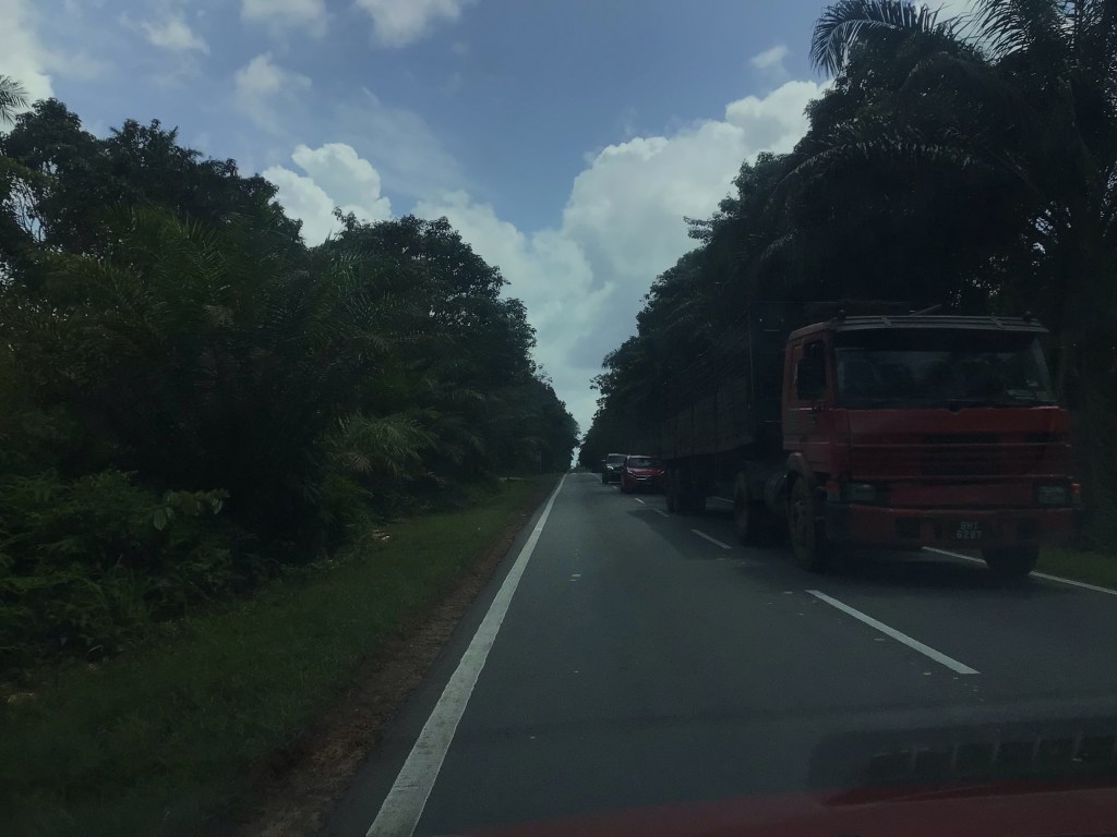 A 10h00, nous partons pour la grande traversée de la Malaisie d’ouest en est. En voiture, la trace GPS indique 270 kms. A vélo, cela aurait été 310 kms mais en empruntant principalement la route principale. Comme partout dans ce pays, il y a très peu d’axes secondaires vraiment déserts. Nous ne regrettons pas notre choix vu la dangerosité de cette route. En effet, après quitté la ville par une 2*2 voies, ce sont maintenant des routes à deux voies, toujours sans bas-côtés, que nous empruntons. Le trafic y est dense, les poids-lourds nombreux.