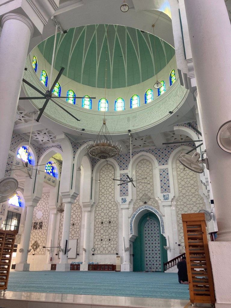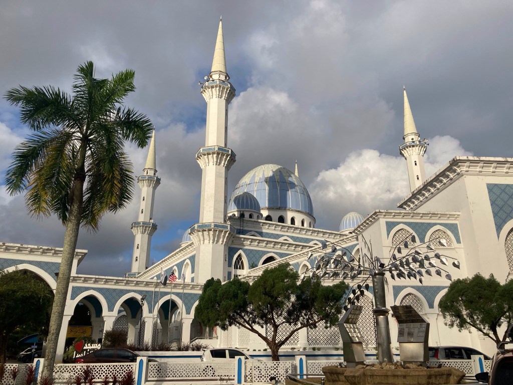 Nous traversons notre quartier résidentiel où l’adresse est indiquée par n° de bloc. Notre hébergement se nomme Terentum 96 Guest House qui se situe à Lorong Seri Teruntum 96, le 96è bloc du quartier. Puis, après avoir déjeuné, nous partons nous balader vers la Kuanta River. C’est original comme nom. La mer se trouve à quelques encâblures derrière une langue de terre. Ensuite nous allons visiter la grande mosquée Sultan Ahmad I. Cette mosquée est la plus imposante de l’Etat de Pahang. Elle peut accueillir jusqu’à 10.000 personnes. Le minaret mesure 180 pieds de haut. Comme je suis sympa, je vous le convertis en mètres : un peu moins de 55 mètres.
