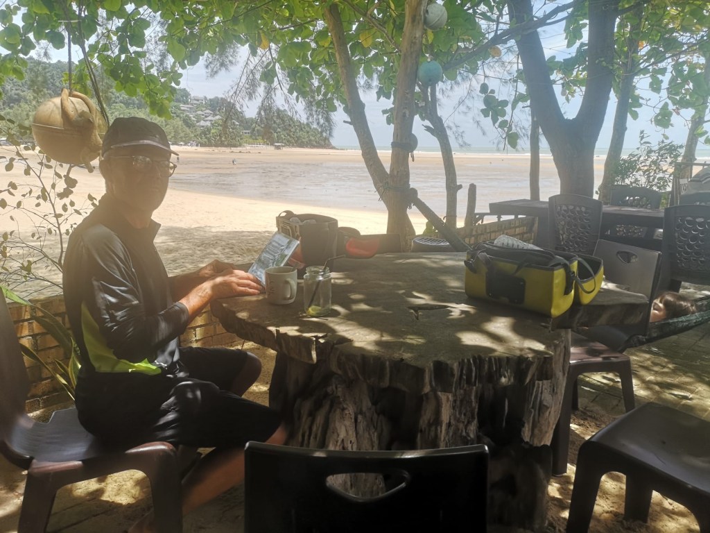 Lorsque nous quittons la route 2 pour entrer dans les terres, le parcours s’avère plus sympathique avec de belles forêts à traverser et quelques rampes à escalader. En milieu de matinée, je m’arrête boire mon café dans une gargotte au milieu de la méga zone industrielle qui occupe toute la pointe de Kampung Gebeng. Nous mangeons également notre avant-dernier Dragon Fruit. Nous longeons ensuite la route 2 devenue 3 (!?!) sur un cheminement qui borde la plage. Enfin !!! Les nuages gris se sont dissipés. Le ciel bleu a refait son entrée en scène. Quelques baigneurs habillés s’aventurent crânement dans les vaguelettes.