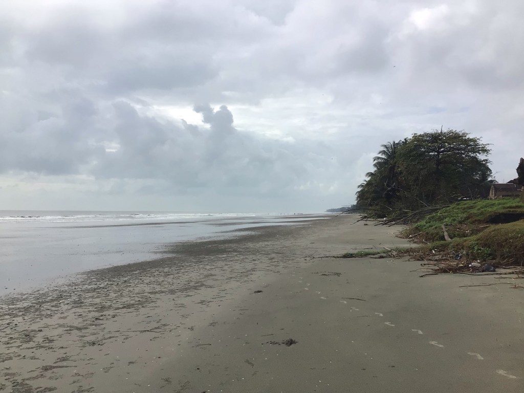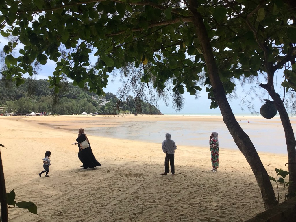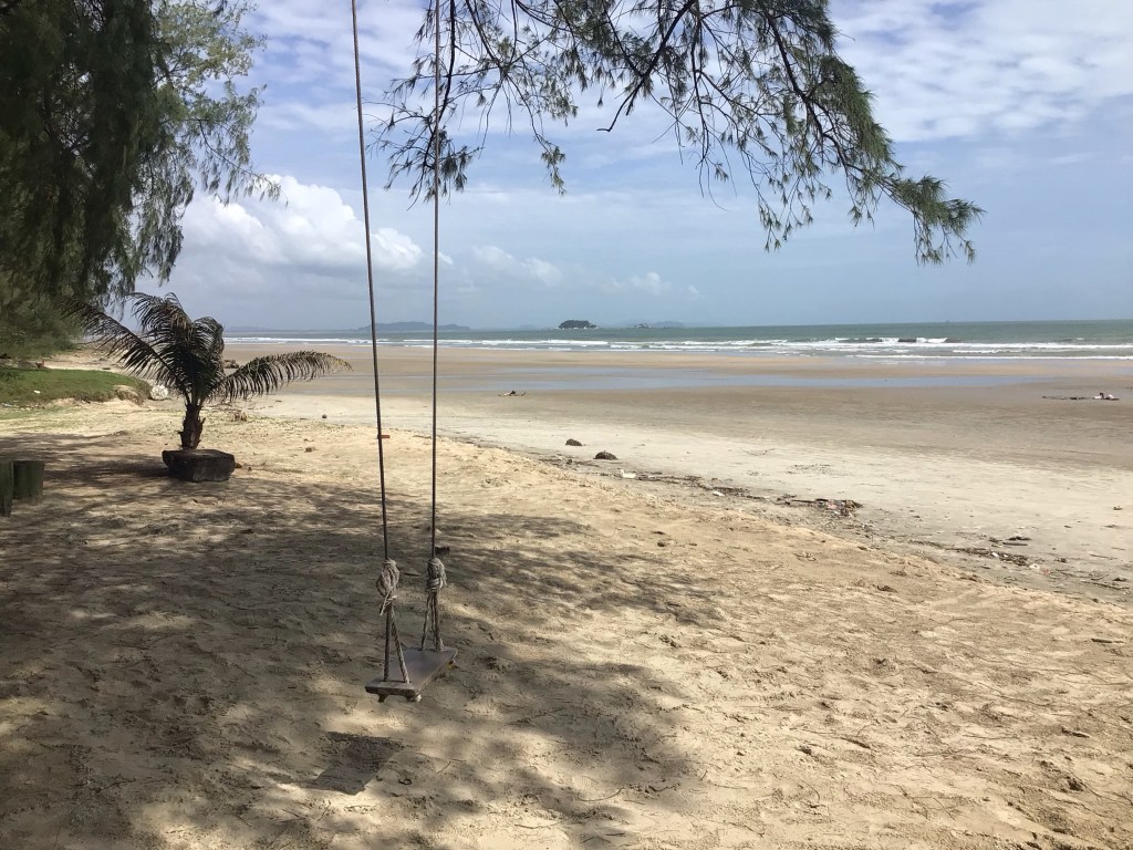 Après cet intermède rôti, nous prenons la direction du sud en passant par des quartiers résidentiels pour éviter la route principale. Comme d’hab’ quoi ! Après avoir coupé la pointe au-dessus de Kuanta, nous arrivons en bord de mer. Le ciel est couvert. La mer est couleur plage.