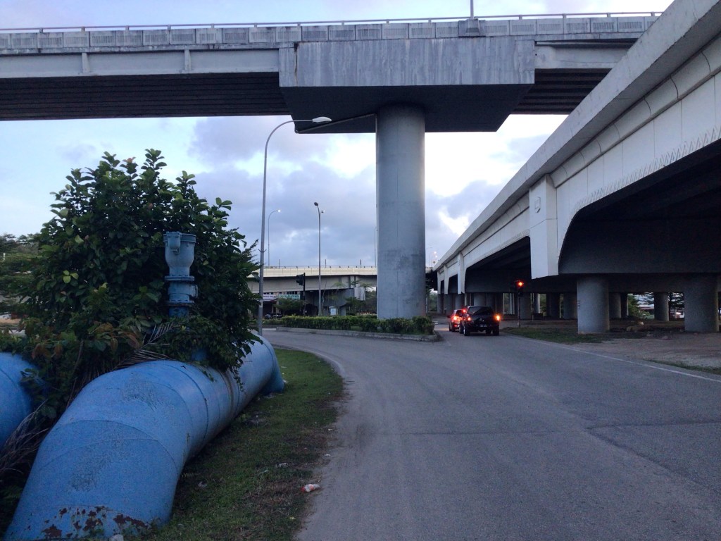 Par contre, Nico s’aperçoit que l’hôtel n’est pas situé à Kijal comme demandé sur Booking.com mais à la sortie de Chukai où nous nous trouvons. Un peu avant 16h00, nous arrivons à destination. L’hôtel est placé, comme souvent, dans un alignement d’autres commerces. Mais là, il se trouve en plus devant un énorme complexe routier à 3 ponts. Autant dire que les clients ne sont pas nombreux. Nous sommes les seuls sur les 12 chambres à louer. Nous ne serons pas enquiquinés par les voisins.