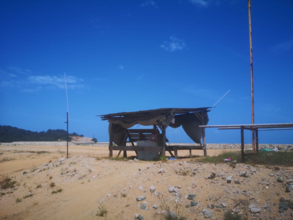 Après avoir traversé cette zone puante et polluante, nous trouvons une gargotte où déjeuner malaisien. Comme le plat principal n’est pas très copieux par rapport à celui de nos amis hindous, nous recommandons une nouvelle assiette de mee (nouille) pour Nico, nasi (riz) pour moi. Finalement, on s’en tire pour 15RM (3€) avec leman ais (citron glacé) et kopi o panas (café chaud sans lait) au total. Ce n’est vraiment pas cher. Après ce repas, nous trouvons un abri sur pilotis en bordure de plage. C’est venté et ombragé donc parfait pour siester.