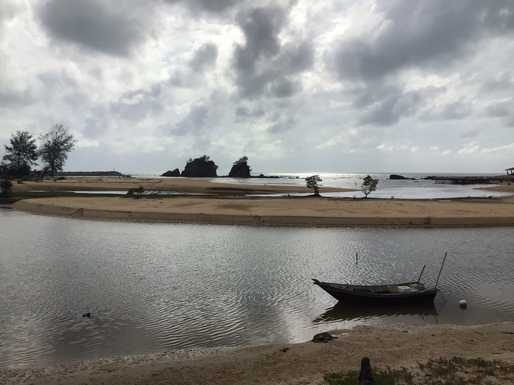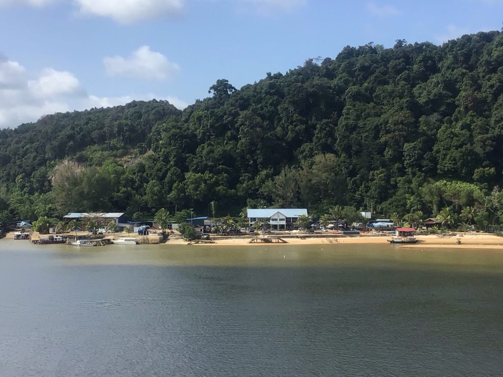 Nous sommes à nouveau obligés de reprendre la route principale n° 3. Cependant, celle-ci longe la côte alors qu’une autre route coupe plus directement à travers une pointe. Nous grimpons à travers une belle forêt tropicale avant de retrouver le front de mer. Nous arrivons dans le long d’une lagune avant le village côtier de Kemasik. Comme hier, le ciel est à nouveau voilé en ce début de matinée. La mer est calme. Les barques patientent en attendant leur pêcheur.