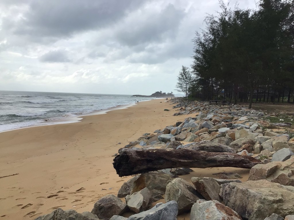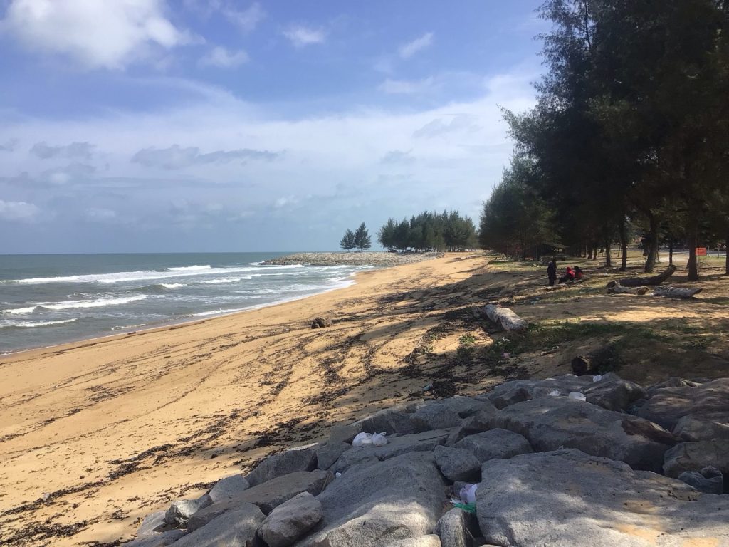 Hélas, il nous faut repartir en direction de Dungun. Auparavant, nous avons essayé de trouver un Home Stay (chambre chez l’habitant) pour nous héberger. Malheureusement, aucun n’a répondu à mes appels ou messages. Nico réserve donc un nouvel hôtel à la sortie de la ville. Nous revenons sur notre chère route n°3. Arrivé en périphérie, Nico me propose de partir dans les lotissements pour éviter le bruit et l’odeur, non pas du marteau-piqueur, mais des véhicules pollueurs. Nous partons sur la gauche. Dommage. Il aurait fallu partir sur la droite pour se rapprocher au plus près de la côte. Nous réalisons notre erreur un peu tard. Finalement, la côte n’était pas si moche que craint par Nico.