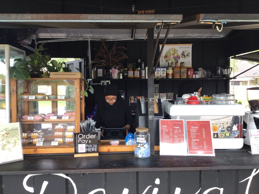 Je commande un americano avec de vrais grains de café moulus accompagné d’un brownie maison. Je me régale. Ce kiosque nommé « Revival live.love.coffee » (tout un beau programme !) est tenu par 2 charmantes jeunes femmes. L’une, celle avec des lunettes à la caisse, parle parfaitement anglais. Comme souvent, nous racontons notre périple. Nous en profitons aussi pour écrire nos mémoires, l’un sur son clavier, l’autre sur son calepin. Pendant ce temps-là, le trafic s’écoule.