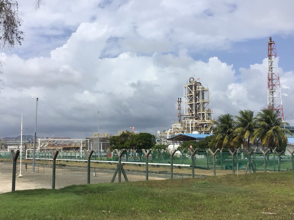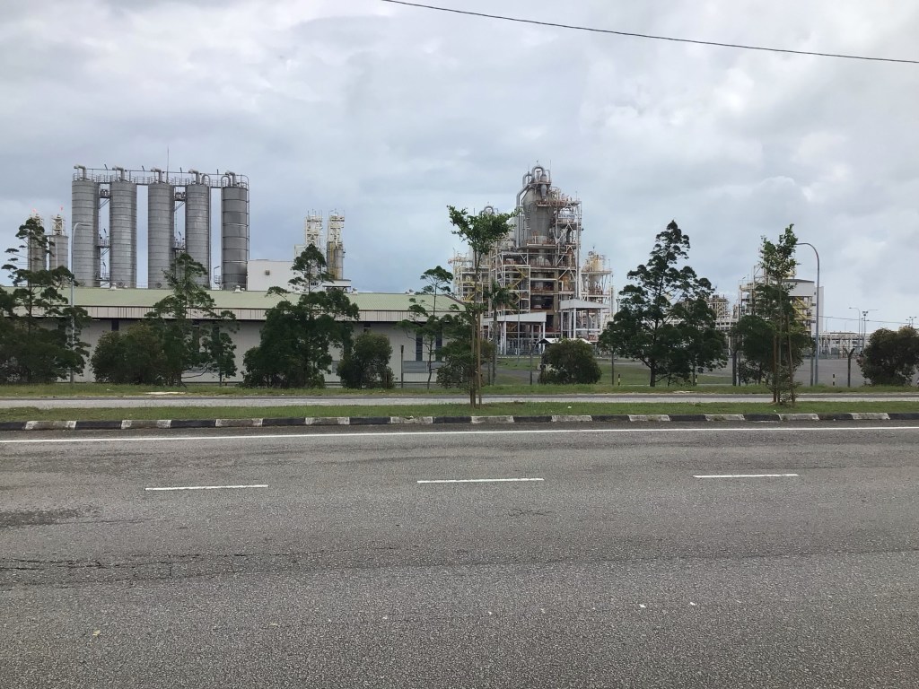 Après cette belle pause, nous retrouvons notre bas-côté et le bruit incessant des véhicules. Alors que nous arrivons à proximité de Kuala Paka, nous traversons une immense zone pétrochimique. Sur notre gauche, de grands complexes.