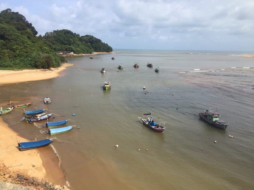 Nous approchons du but. Nous nous posons une dernière fois pour boire un verre de citron glacé dans un bar à pêcheurs (et non un pêcheur de bars). Il nous reste à franchir le pont qui surplombe le fleuve Sungai Dungun. De haut de ce pont, nous surplombons le fleuve qui se jette dans la mer. Un bateau de pêche rentre au mouillage en évitant les hauts-fonds au milieu du fleuve.