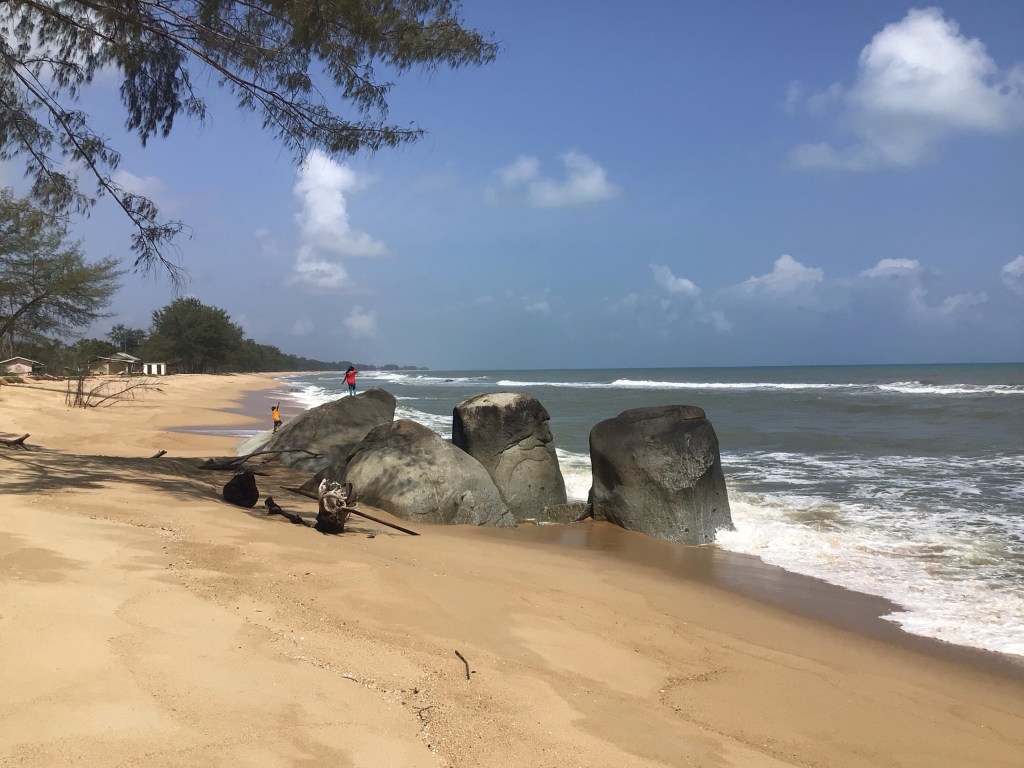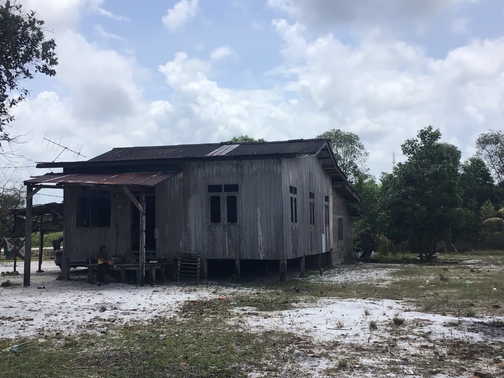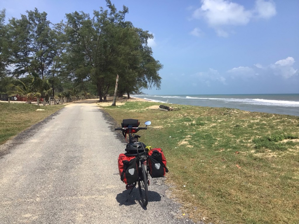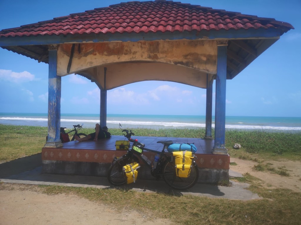 A midi pile, nous nous arrêtons déjeuner en bordure de mer à Kampung Beting Lintang. Nous profitons une dernière fois de ces paysages. En effet, nous allons hélas devoir rentrer dans les terres pour contourner un bras de mer et des marécages. Le sourire est encore sur les visages. Cela ne va pas durer …