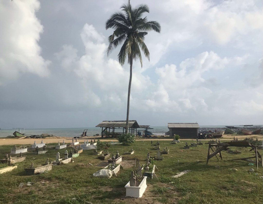 Avant de récupérer la route secondaire 3685, nous nous arrêtons déjeuner dans un restau hindou blindé. Ce sera roti canai et telur. Nous longeons la côte en suivant la petite route T148. Nous passons devant un petit cimetière musulman en bordure du littoral. Le ciel est à nouveau menaçant.