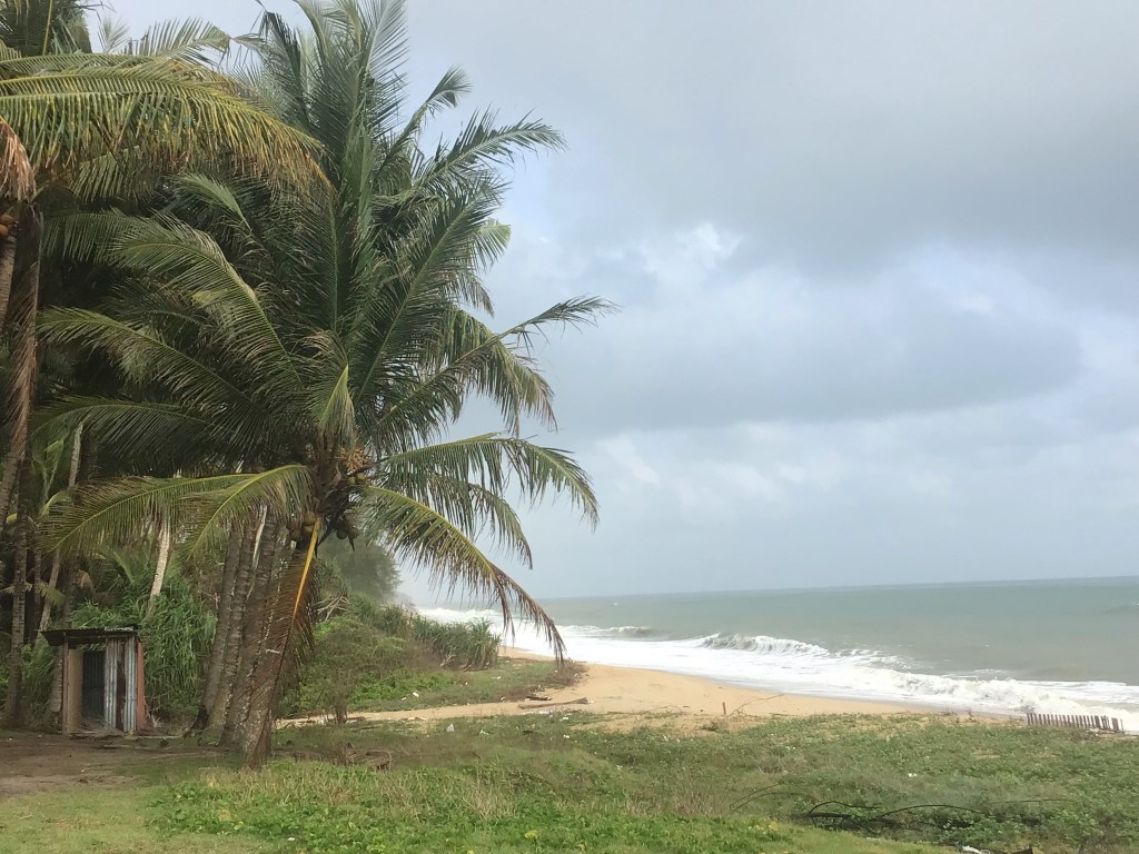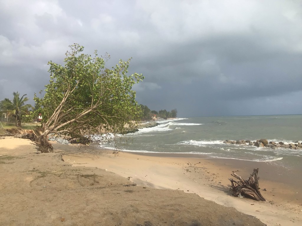 Nous continuons notre cheminement sur cette charmante route. Par contre, la côte sableuse est attaquée par les vagues de la Mer de Chine. Des renforcements en pierre ont été construits le long de cette côte pour casser les vagues. Sera-ce suffisant pour endiguer la montée prévue des océans ? Je ne pense pas. C’est comme de mettre en emplâtre sur une jambe de bois. Le ciel s’assombrit de plus en plus. Nous allons droit dessus.