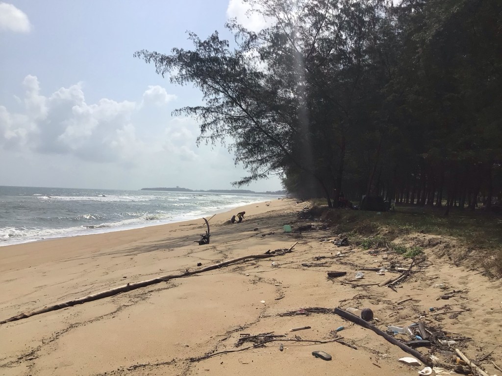 Nous passons Merang qui dessert les îles de Bidong, Redang et Lang Tengah. Dès que nous le pouvons, nous quittons notre nationale pour retrouver des villages en bord de mer comme ici à Kampung Telaga Putat. Une famille a planté la tente sous les frondaisons malgré les détritus qui jonchent toujours plages et forêts. Les enfants jouent dans ce beau décor souillé.