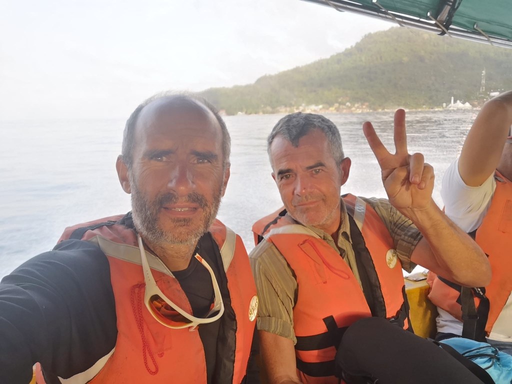 Puis nous allons déjeuner sur le quai de l’embarcadère. Ce devrait être notre dernier roti canai malaisien si tout se goupille bien. C’est un des meilleurs que nous ayons mangé. Il a été préparé par une vieille femme. Ensuite nous filons sur l’embarcadère. Un premier bateau arrive mais ce n’est pas notre compagnie. Nous patientons. Un second accoste. C’est le bon. Le pilote récupère ensuite un couple de jeunes français, un couple anglais aperçu hier au snorkeling et un père américain avec sa grande fille et son grand ns fils, aux pontons de leurs hôtels respectifs un peu plus chic que le nôtre. Nous enfilons notre gilet de sauvetage au cas où …