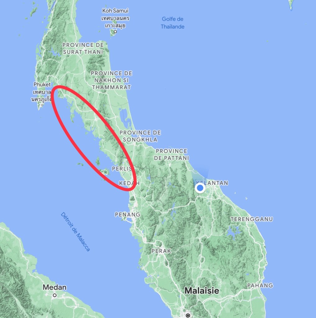Arrivé à Kota Bharu, je repère, toujours pas hasard, le bâtiment de la police (polis). Ce n’est pas compliqué. C’est toujours un grand bâtiment blanc avec des couleurs bleues. Les pompiers, c’est blanc et rouge. Nous voudrions savoir si la frontière en bord de mer est bien ouverte. Nous n’avons pas encore décidé quel sera notre programme futur. Les deux personnes à l’entrée me confirment que c’est bien ouvert de 8h AM à 7h PM. Avec cette info, nous nous posons dans un endroit ombragé. Nico sort sa carte d’état-major. Moi ma tablette. Après concertation, nous décidons de monter jusqu’à la frontière thaïlandaise mais à l’intérieur des terres pour filer ensuite vers la côte ouest soit à vélo, soit en train si le parcours est très monotone. Nous ne passerons finalement pas par la côté est thaïlandaise qui parait vraiment trop chiante. Et on a déjà donné.