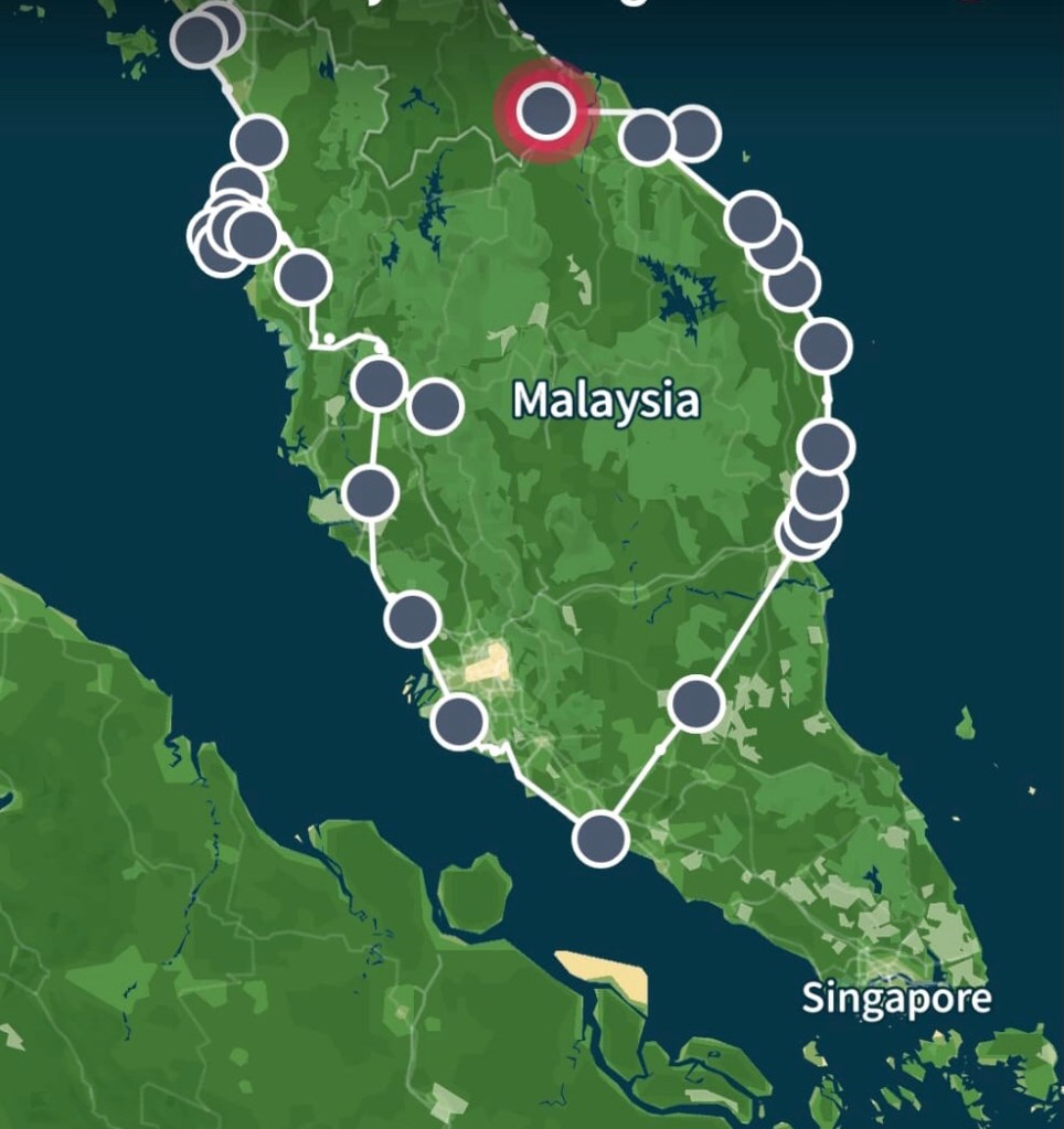 Avant que je n’oublie, je publie le tracé de notre parcours en Malaisie en rappelant que la montée vers Cameron Highlands au centre a été effectuée en bus et que la traversée au sud en taxi Grab.